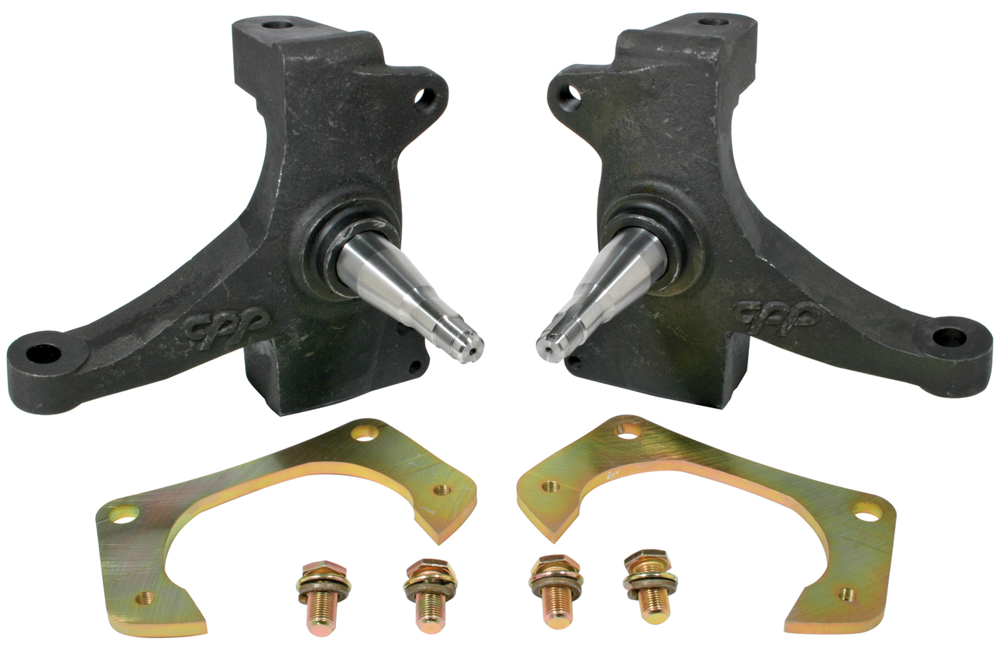 One piece forged nodular iron design with pressed in alloy steel axle pin, installs with no modifications, lowers your vehicle 2 1/2". This is accomplished without moving the wheels out. When using the bracket kits, they work with rotors and calipers that you can purchase at your local parts store. They also work with CPP