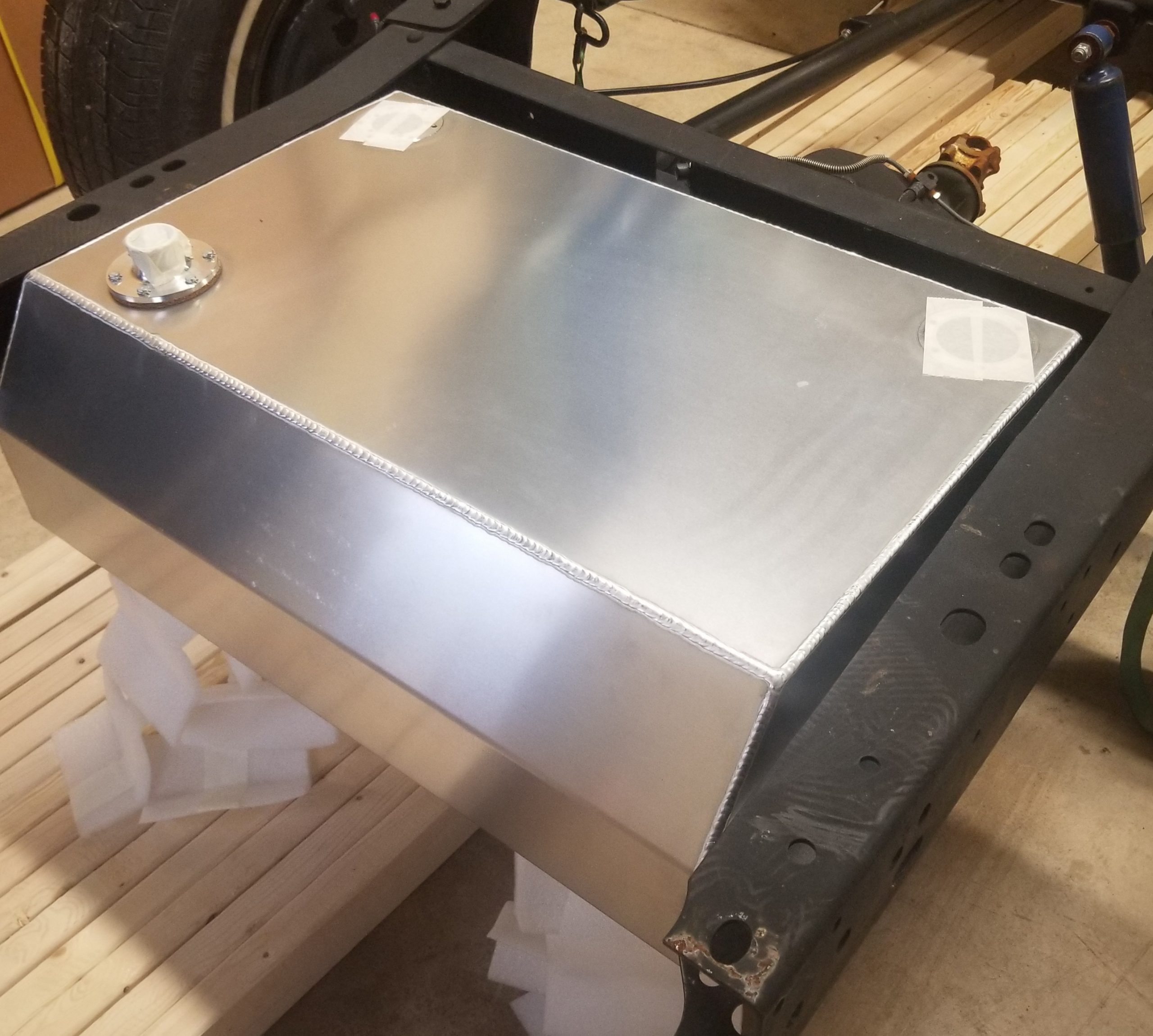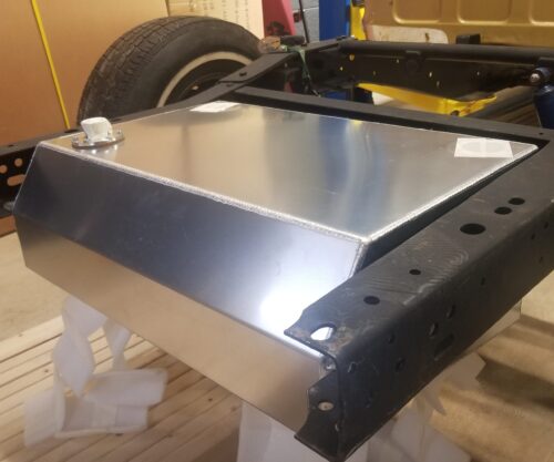 Bed fill flush raw aluminum 20 gallon tank. These new aluminum fuel tanks fit between the frame rails and are fully baffled and have an internal fuel trap. They can run an internal or an external fuel pump. There is an extra fuel port into the fuel trap so they work great with either a